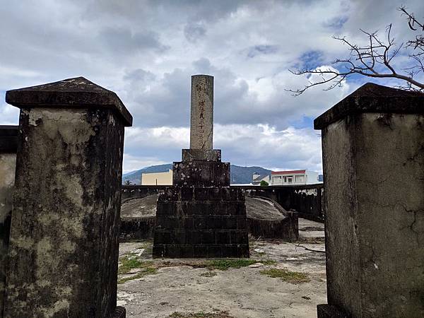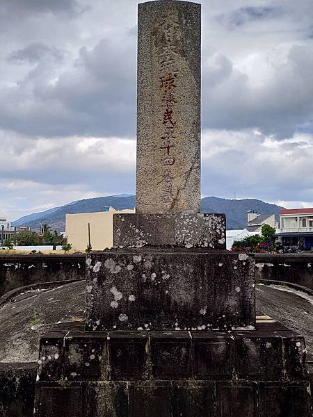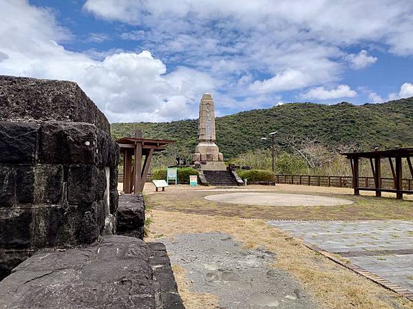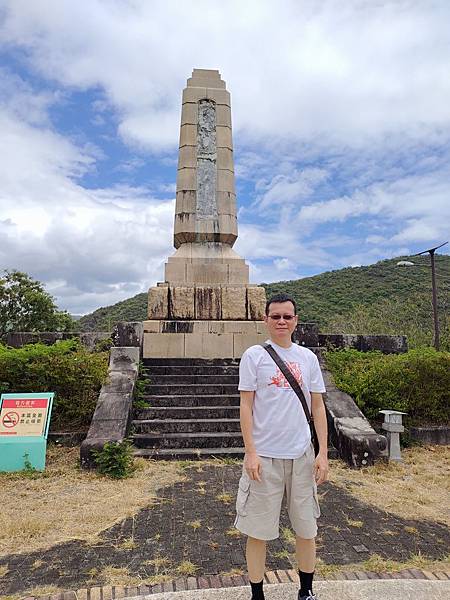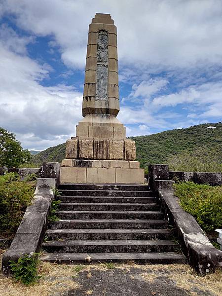 山頂平台上,個頭比較矮的是日本設立的忠魂碑。它是1936年(昭和十一年),日治時期豎立的「征番役戰死病歿忠魂碑」,用以紀念當年死亡的五百多名日軍。但碑文被討厭日本的“愛國人士”刨去,現如今只剩下黑底基座。